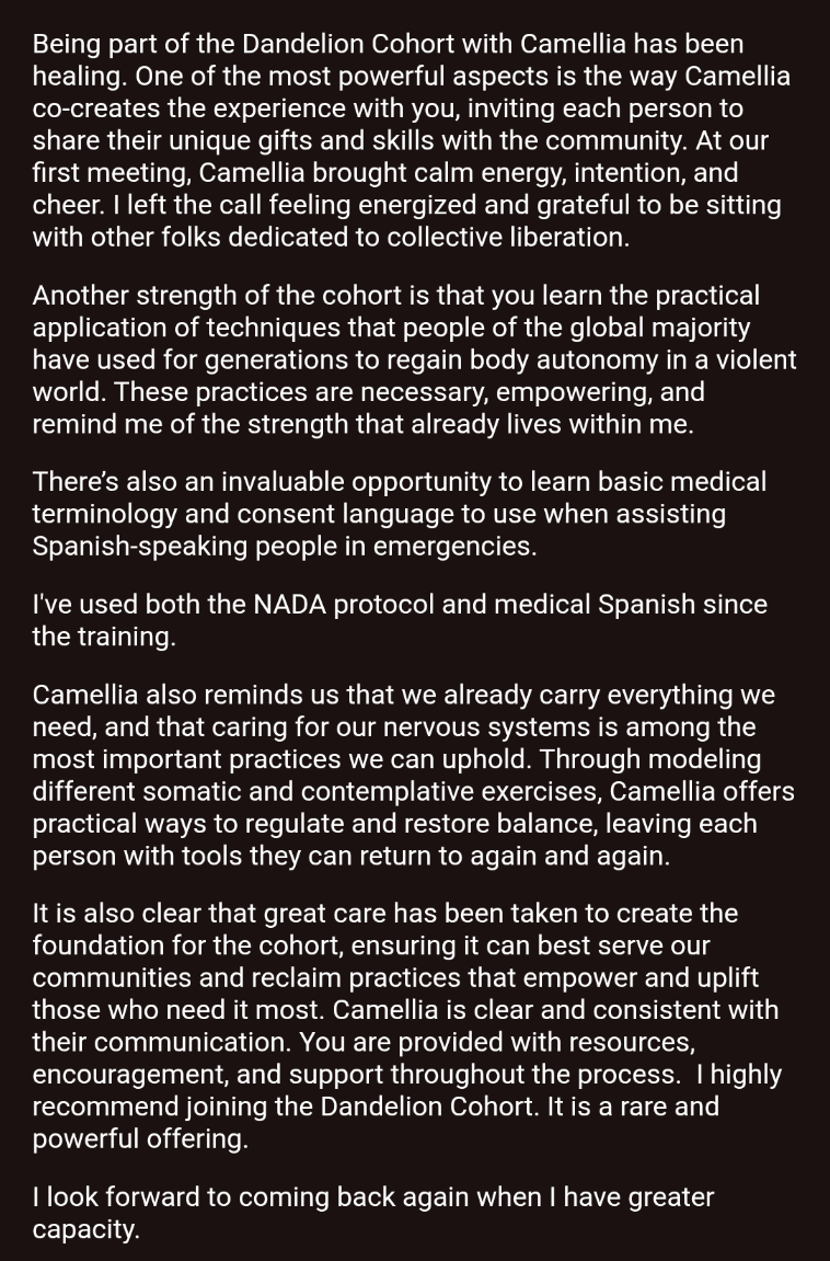 We empower our communities with culturally-competent, equity-focused healers trained in ancestral healing modalities because integrative care is for everyone. By removing structural barriers to training in and offering care, we respond to structural violence with a sustainable, preventative, by-us-for-us solution. The Dandelion Healers learn technologies of traditional medicine and support each other in practicing Healing Justice by offering low-barrier care to those impacted by systemic violence.