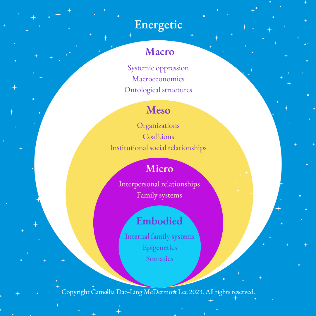 Spiritual/energetic/embodied healing practices that deny material reality are always going to fall short. The graphic above is how I see mainstream healing play out: those individuals with access to resources get a little better and it impacts their micro- and meso- environment, but the big picture doesn't transform. Structures like environmental racism, patriarchy, and white supremacy continue to systematically cause harm.